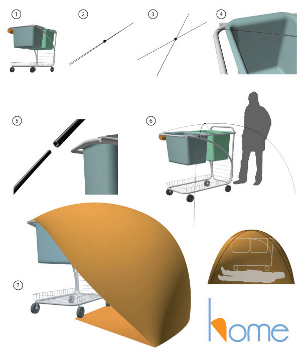 Home is designed for homeless peoples, the public, charity organizations, and our planet. The foremost goal for this project was not to simply provide shelter and storage, but to create a home for a human being. A home is a place where you can escape the outside world, shelter yourself from the elements, as well as relax, maybe even with a pet. Home begins to approach this goal by offering the cart owner two bins; one to store personal items storage such as clothing, collectibles, and currency. The second bin can function as storage for recyclables that can be redeemed for income. The bins also offer a level of privacy, whereas shopping carts have see-through metal mesh, the injection molded bins allow personal items to remain personal. Other areas of storage are also available; a lower mesh rack, a rear mesh rack, and a strong tubular frame that external items can be tied to. The rollup nylon shelter has many storage options, two velcro straps allow the shelter pack to be mounted in several positions for each users unique preferences. The shelter consists of four flexible yet rigid pvc frame poles and one continious sheet of ripstop water-resistant nylon, and requires less time and effort to setup than most free-standing tents. The shelter conveintiently allows the user to have full-access to all of their protected belongings in the cart while inside, giving protection of personal belongings from theft during the night. The shelter cacoons the user on all sides, with a floor that connects to the wheels of the cart. The interior volume is generously sized, offering 213cm (7ft) lengthwise, 76cm (2.5ft) of width, and adequate headroom for a large male to sit upright. The design also reflects on the rising awareness of the safety of our homeless today - with two large windows for maximum visibility, while still retaining shelter from the elements and privacy. The color choice of orange is to draw attention, to make passer-byers aware a fellow human is inside. Home is designed utilizing sustainable materials that are friendly to our planet and to the limited budgets of donating charity organizations. The majority of the cart is made from extruded Treeplast®, (www.treeplast.com) a 50% wood, corn, and natural resins mix, which is then coated with waterproofing lacquer. Home was created with ease of manufacturing in mind; three extremely workable and cost-effective materials were chosen for their characteristics and consisting of only nine simple parts. Home effectively acts as storage for personal belongings, facilitates recycling to provide income, protection from the elements, allows for sustainable and affordable manufacturing, and creates an environment that the user can find comfort in and identify with as his or her own home.