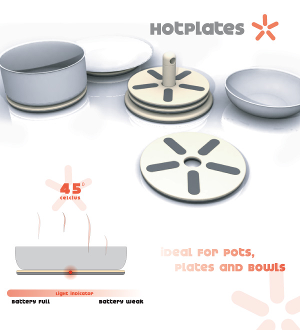 Hotplates are a series of 5 placemats used to place hot dishes on or dishes that need to be warmed up. Pots, plates, bowls and even drinks can be warmed up. The hotplates are then easily charged by just placing them into the charger and a ring grip makes handling easier.