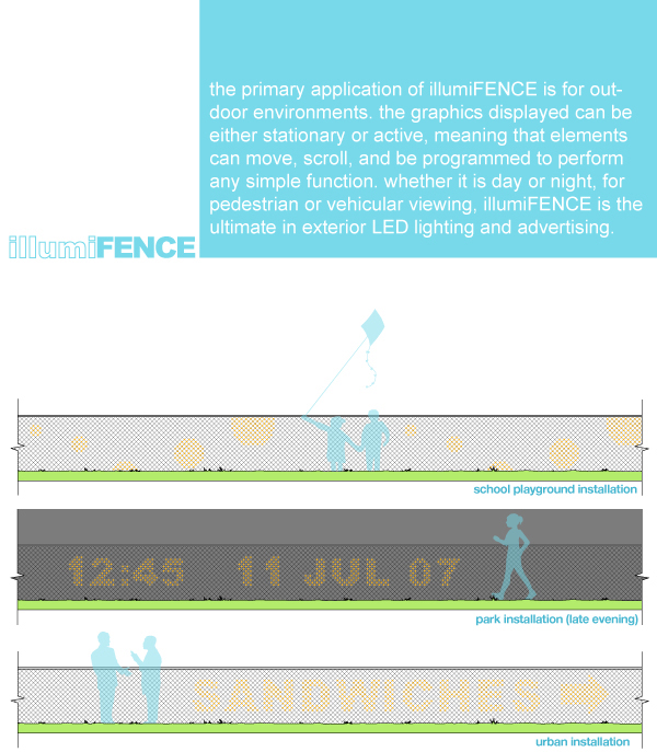 the primary application of illumiFENCE is for outdoor environments. the graphics displayed can be either stationary or active, meaning that elements can move, scroll, and be programmed to perform any simple function. whether it is day or night, for pedestrian or vehicular viewing, illumiFENCE is the ultimate in exterior LED lighting and advertising.
