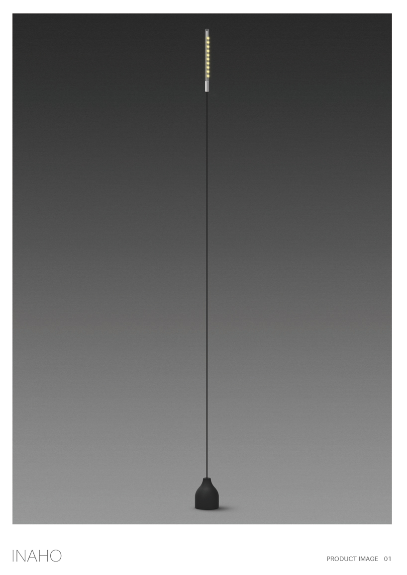 In this application, we propose to create a golden field with 100 - 200 pieces of INAHO. It is an installation where people could visit and feel the golden luminous grass that responds to the visitor. For example at home, a few pieces of INAHO light will bring a more relaxing and richer time. In a commercial space, dozens of INAHO will make a new entrance which welcomes visitors by making swaying motions according to their steps from outside to inside. This product would play roles of an ornamental plant, indirect lighting and also as communication.