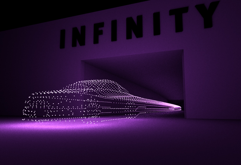 this installation consists of two core elements. the first one is the shape of the car. it is made of LEDs hanging from the ceiling on thin black wires (or it could be possible to attach the diodes to wires standing on the ground). for parts of the car like wheels, lights, etc, multicolored diodes with the ability to change the color could be used instead. this feature would enable to “animate” the sculpture for a better visual effect. the second core element of the installation is an “infinite mirror”. it is basically a sandwich made of a semi-reflective mirror and a regular mirror. if you put a source of light between these two mirrors ( in our case diodes ), the light will be reflected back and forth and create an illusion of infinite space (see attached pictures). if the regular mirror is slightly angled, it creates an illusion of a giant curved tunnel. in the infinite mirror, there will be only one “layer” of the car, made of several LED diodes. but it will create the effect of thousands of layers stacked one after another. the overall impression of this installation should be an illusion of infinite strings of diodes that form into a car in front of the viewer.