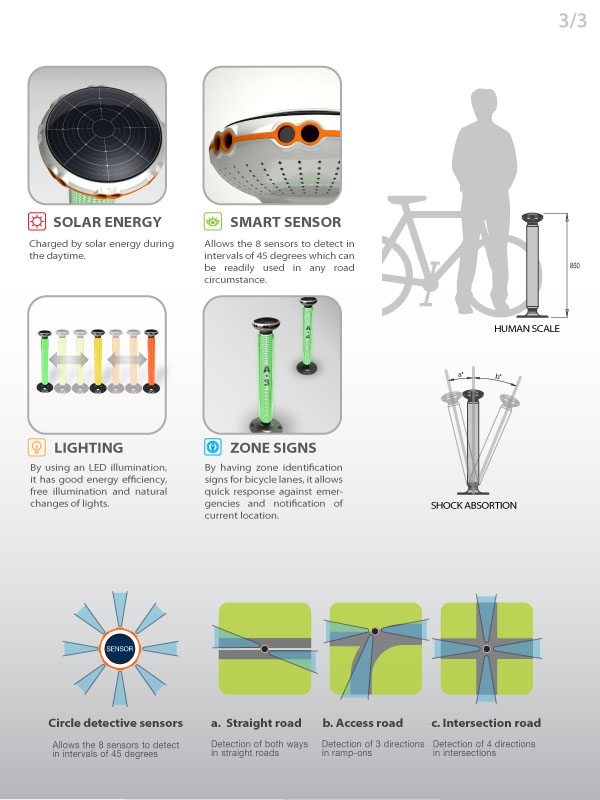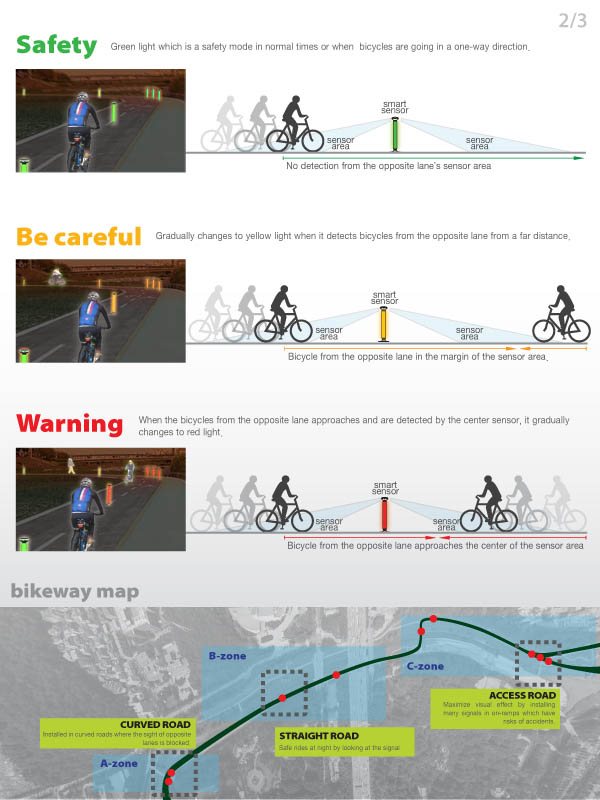 INTERACTIVE BICYCLE SIGNAL deviates from the one-way signal method, and enabled traffic control according to the flow of bicycle riders. It is located in curved roads or on-ramps which have high risks of accidents, and alarms the riders with a green light in case of a one-way traffic lane, yellow & red light in case of detecting a bicycler from the opposite lane. Also, by functioning as a safety light in the night, it prevents collisions of bicycles at night. It also has a zone identification message on the outside which allows convenient notification of locations. In an emergency, it enables quick responses. These functions provide a traffic system that takes care of the overall guide and safety of bicycle lanes.