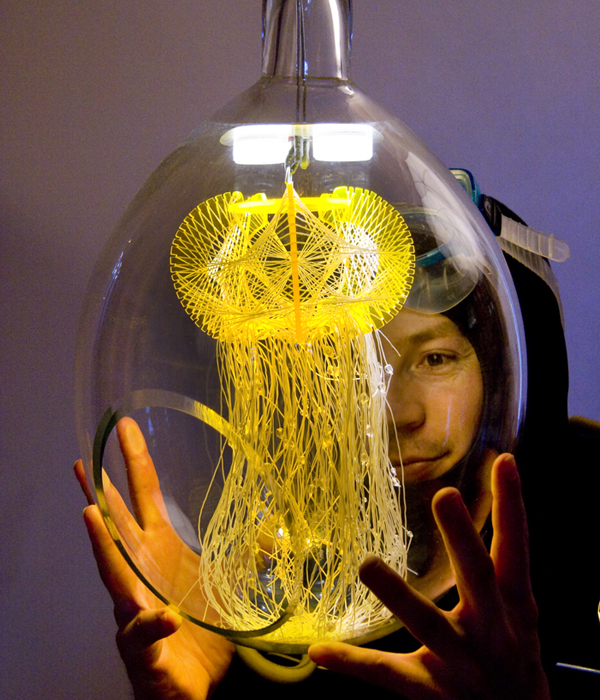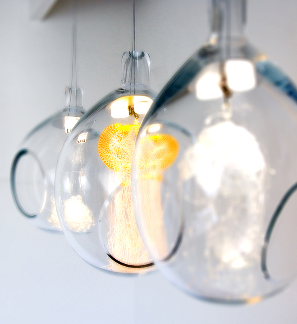 A mouth-blown Bubble with or without a jellyfish as a unique filtering object. Interchange the jellyfish and experience a new expression, a new light and new shadow effects..