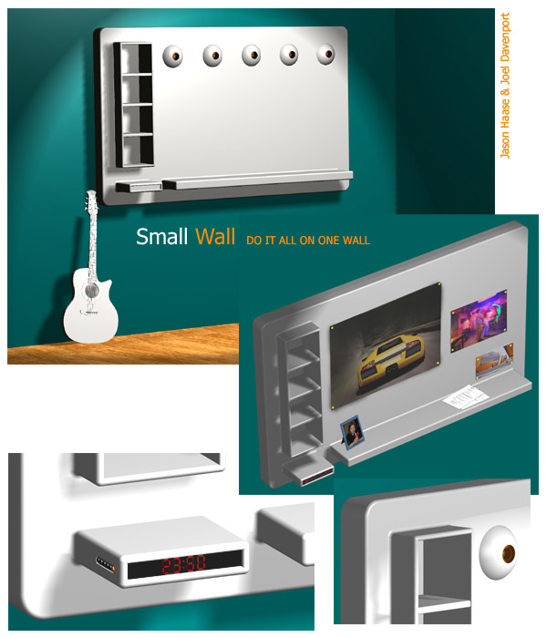 Plastic wall mounted storage device with integral speakers and alarm clock. Just plug in your Ipod or minidisk for instant surround sound. With a magnetic backing posters and photos of friends and family can be quickly mounted and changed to suit the mood. This all-encompassing storage device is aimed at those growing up fast and Small Wall is designed to adapt with them.