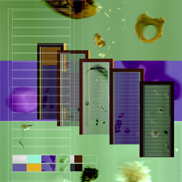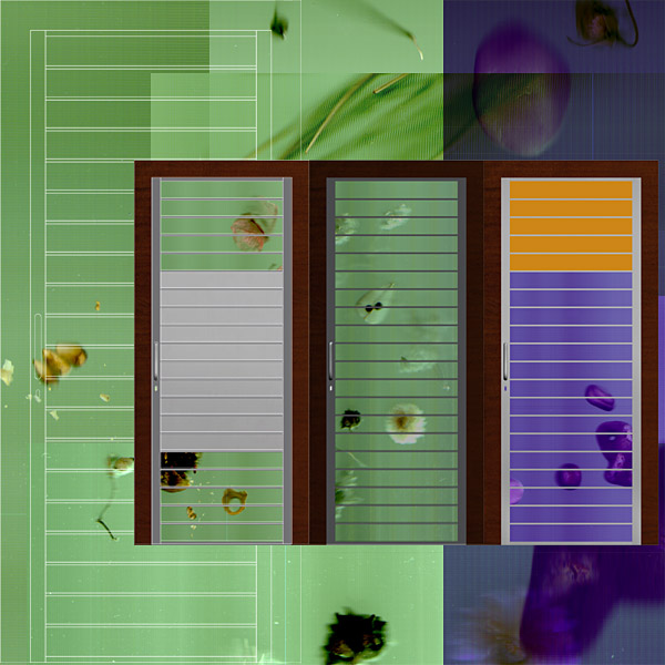 sliding or shutter door, made by a satinated steel/aluminium structure, two tonality dark wooden frame, serigraphed or printed translucent glass panel (originals of mine), which can be alternate with coloured translucent glass or full parts in satinated steel/aluminium, eventually printed or serigraphed with the same motive, taken from a gamut of pictures.