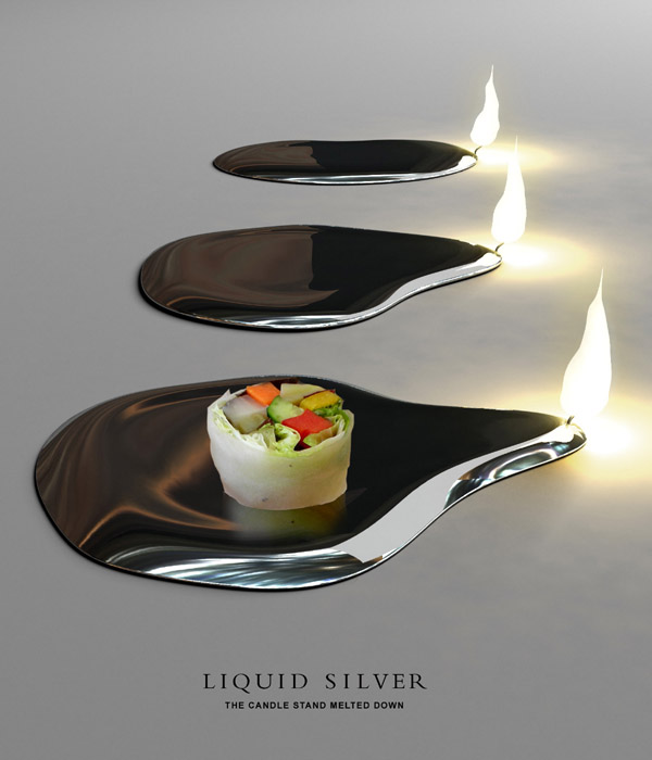 The fire of a candle reflects and shins on the body like flowing silver liquid metal. and dinner will be skillfully illuminated by it.
