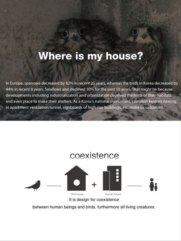Concrete buildings standing densely in each and every city mean shelters to human beings, but the same buildings mean lost habitats to animals in a sense. “Live-with-Birds” is a design dreaming of a city where human beings and nature can coexist in harmony. “Live-with-Birds” is an idea of allowing for both man and nature by yielding some space of building walls to birds which are deprived of shelter.