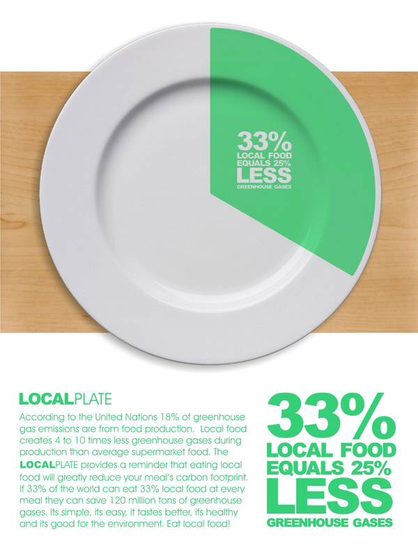 Studies led by Rich Pirog at the Leopold Center for Sustainable Agriculture at Iowa State University have shown that meals prepared with food from local sources produce 4 to 10 times less greenhouse gases than meals prepared from the average supermarket (less processing, packaging, shipping, etc.). That means eating locally can drastically reduce ones carbon footprint. The LOCALPLATE is a reminder that simply eating local food, even if it is only a fraction of the meal can have great impact on the environment.