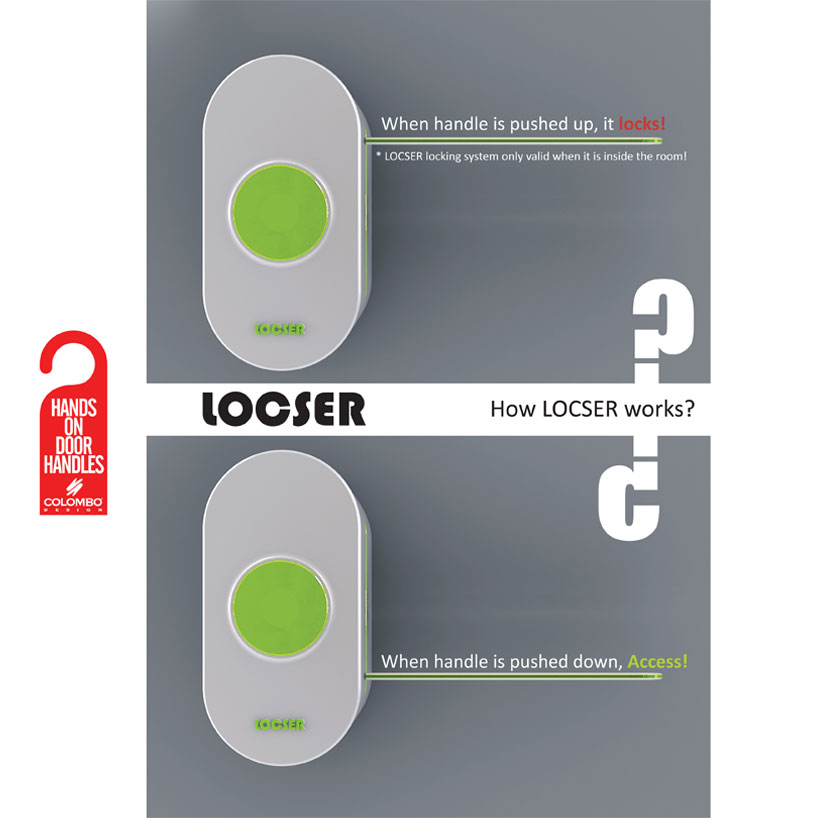 LOCSER is made up of SUS (Main Body), Self illum resin + PC (Handle) and TPU (Slider slot). With the smooth chrome finishing and bright green, LOCSER hope to achieve a different Handle & lock concept. Not forgetting the handicap, dual blindman dots are applied at the sides of key hole.