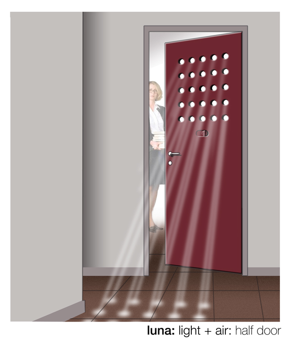 Luna is a simple and understated door with a mysterious character that provides a surprisingly functional feature. The series of holes in the door can be opened and closed by sliding the knob; which adjusts the amount of light, air and noise between two rooms.