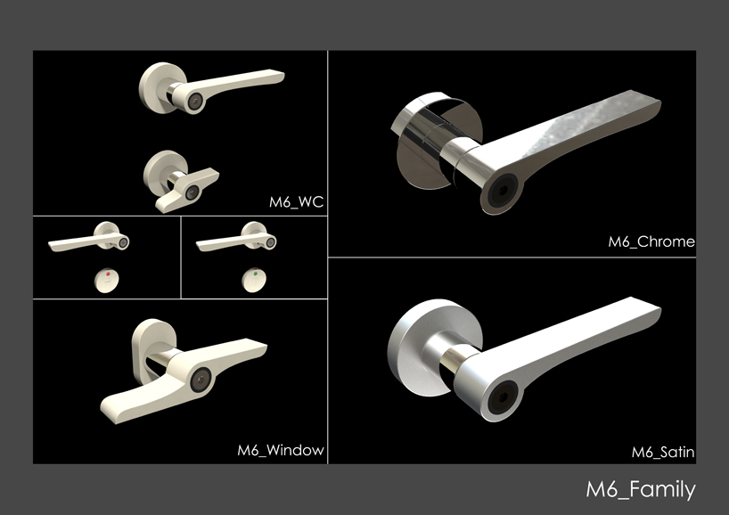 model M6 indicates formal simplicity as well as creative variety. i set out to develop a door handle in different materials and colours other than chrome and satined steel without rejecting standardized norms.to create a handle looking playful yet technically convincing.
