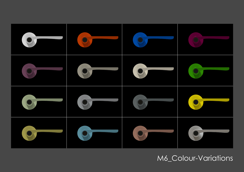 this way M6 can be adapted to or contrasted with its environment by ways of colour. the handle itself is connected to the thorne (mandrill) with a m6 screw, fixed with a flexible washer. therefore the model name M6.