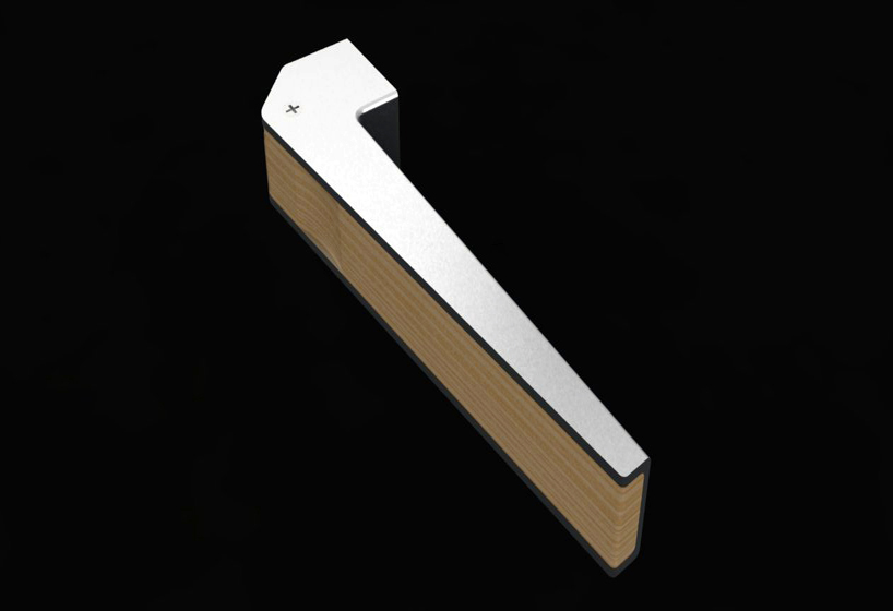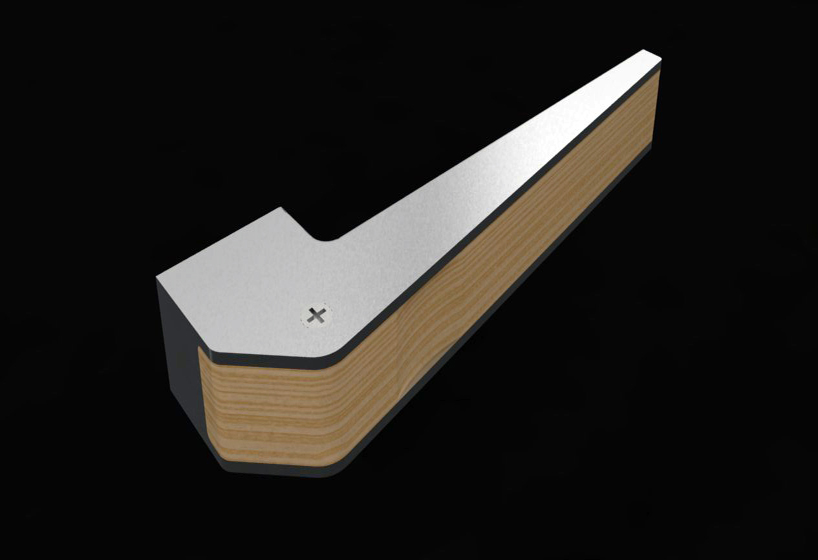 its one piece aluminum door handle with maple wood that is taken from wood shops and recycle on this door handle so is very easy to manufacture and helping to use wood waste and add it to this beautifull door handle that has a very unique design and a screw of stainless steel could be manufactured in both aluminum or stain less steel and has an ergonomic space in the wood for the thumb finger so its more confortable when in use.