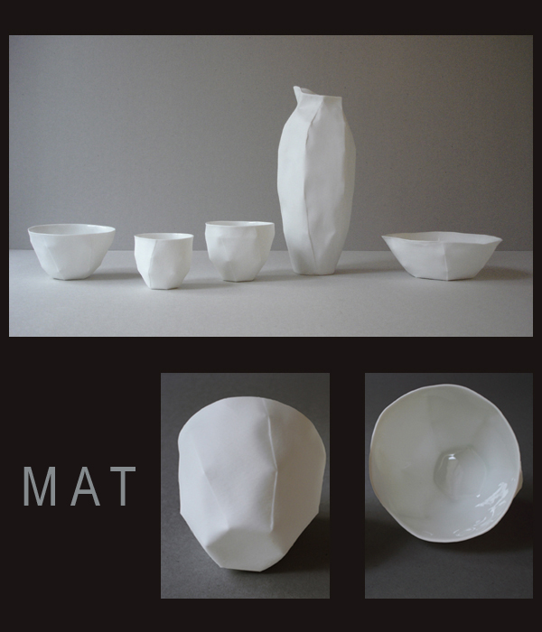 With his whiteness, fineness and lightness porcelain reflexes the essence of paper and his human fragility. Outside the porcelain biscuit answers the lustreless of paper and inside is enamelled to make practical for use.