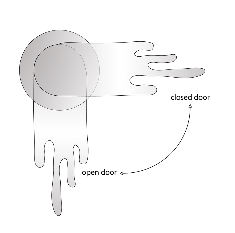 the door knob was designed to look like it melted & thus elongating the knob to handle length. when the door is open the knob position looks like a melted door knob but when locked/when the door is closed, the knob is turned to the handle position. when in a handle position the knob no longer looks like it's melting but merely handle in water form.