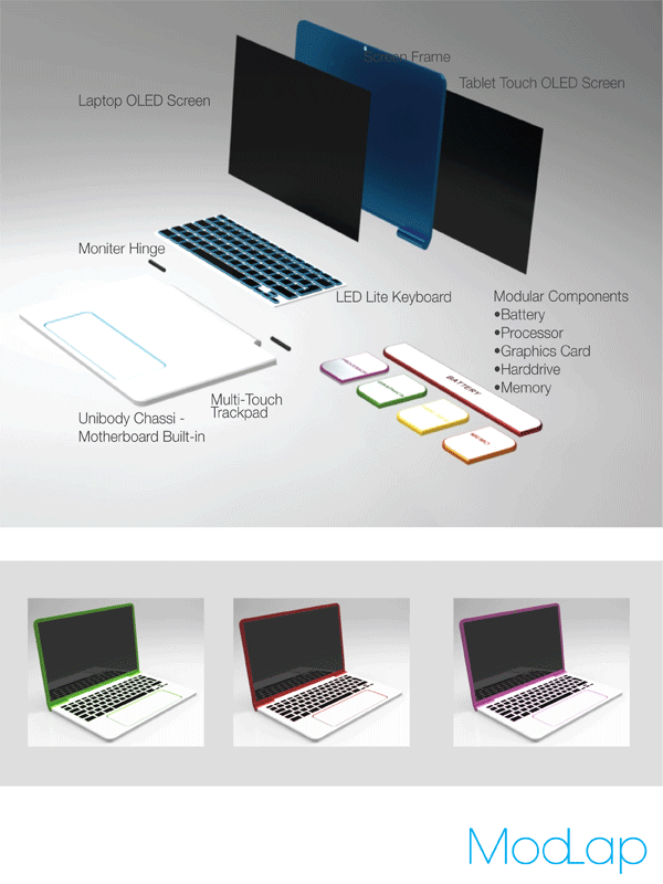 ModLap is a sustainable laptop which features a dual OLED screen, and a touchscreen tablet that allows the user to instantly upgrade their computer without having to purchase a new computer year after year. ModLap features five modifiable slots for hardware that is most common to upgrade yearly; memory, hard drive, graphics card, processor and the battery. ModLap allows the user to simply pop out their existing hardware and replace it with a newer and instant upgrade.