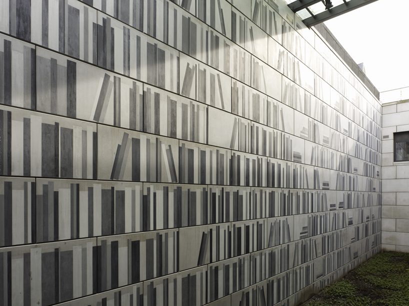 at the request of ghent city council, anouk de clercq designed a monument to students. in the vacant space of the saint peter’s square, near the church of saint peter’s abbey, on the large wall beside the stairs, she created a work that runs over several levels. the image on the wall in the underground car park of saint peter’s square portrays a library full of book spines, composed in a rhythm of rectangles in various sizes and shades of grey. an abstract library.