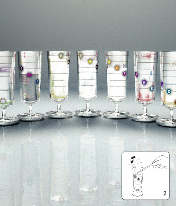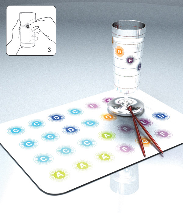 Party more fun and interesting with the musician’s goblet. Marking in the goblet (C,D,E,F,G,A,B) pointing out the musical sign sonority (1) denoted/indicated by liquid volume of the glass. Invite friends to play musics between one drink and another (2). Accompaniment of two drum sticks, a table set with the song “happy birthday to you” and decals to attach in different kinds of glasses and goblets to play your favorite songs (3).