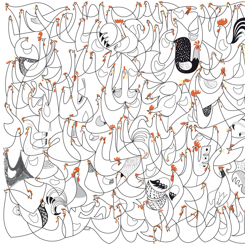 the chickens are laid out on a geometric diagonal pattern in order to bring some order into the illustration. the diagonal lines bring a movement to the chickens and even each one of them has its own individual characteristic the pattern effect gives a sense of unity to this group.
