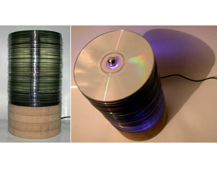 After growing frustration at the amount of cds wasted through failed burnings and a growing pile saved and collected, I highlighted the wonderful light reflective and conductive properties of the cds along with a cycling coloured light stick normally used in cars and a standard light fitting from a house lamp to make two different lights both giving off a rainbow of colours.