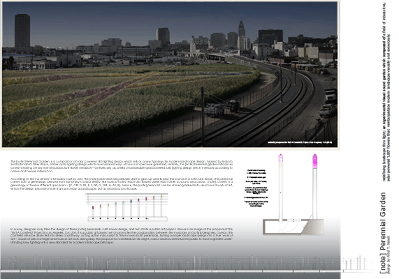 According to the movement of shadow cast by user, the [note] perennial will gradually start to glow up and to play the sound of a note. Like flower, the perennial comes from a genealogy – each LED flower will differ one another by sound and by colour; in relation to the theory of light and wavelength, the LED flower piece will be in cast in different shade, according its relation to the note which the flower piece makes, for instance, as it is displayed in the image next to, red as Do [C], orange as Re [D], and so on. Hence, the [note] perennial design can be choreographed into visual sound work of art, which the design of the landscape becomes artscape. In a way, designers may take the design of these [note] perennials – LED flower design, and turn it into a public art project. Above is an image of the proposal of the ‘Not A Cornfield’ Project in Los Angeles, CA, USA. It is a public art project which promotes the collaboration between the musicians and artists/designers. Overall, the Cornfield site is be dissected into series of pathway, acting as the manuscript to these musical LED perennials, turning a simple landscape design into a true ‘work of art’ – visual art piece at night and musical art work during day. The proposal for Cornfield act as a light, colour and sound festival for public to have a greater understanding how lighting sets a new standard for modern landscape/artscape.