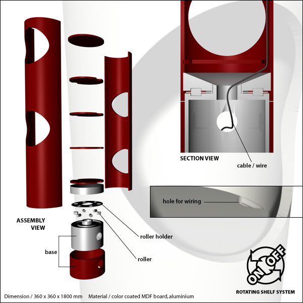Teenagers now are always busy with studying for school and playing/relaxing themselves or with friends. The "ON/OFF" rotating shelf system with two interchangeable sides is for those teenagers to make the most of their precious time----study hard (by getting rid of the temptations!) and play hard (by forgetting about homework!).