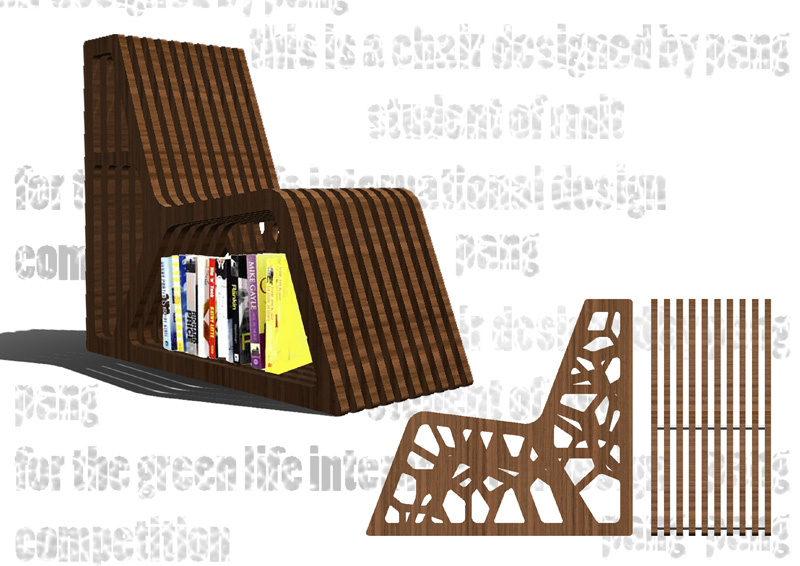 This design includes a lounge chair and wall elements (tiles/wall decoration). The chair is created out of 10 bamboo panels. One side of the chair shows an interesting feature created by overlapping chair panels with different cut out patterns. These patterns are inspired by the tiny veins on a leaf. It reminds us on how marvellous nature could be. The other side of the chair has big hollow cut outs that act as a storage unit, thus giving the piece a second function. This chair is design to be made out of bamboo boards. Bamboo, being the worlds fastest growing woody plant, is a highly renewable, biodegradable and recyclable material. A cutting plan is also designed to keep the waste to a minimum when cutting the chair panels out of a standard size bamboo board (1200mmx2400mm). All the off cuts are slightly shaped and could be turn into wall elements (tiles/decoration), resulting very little waste produced.