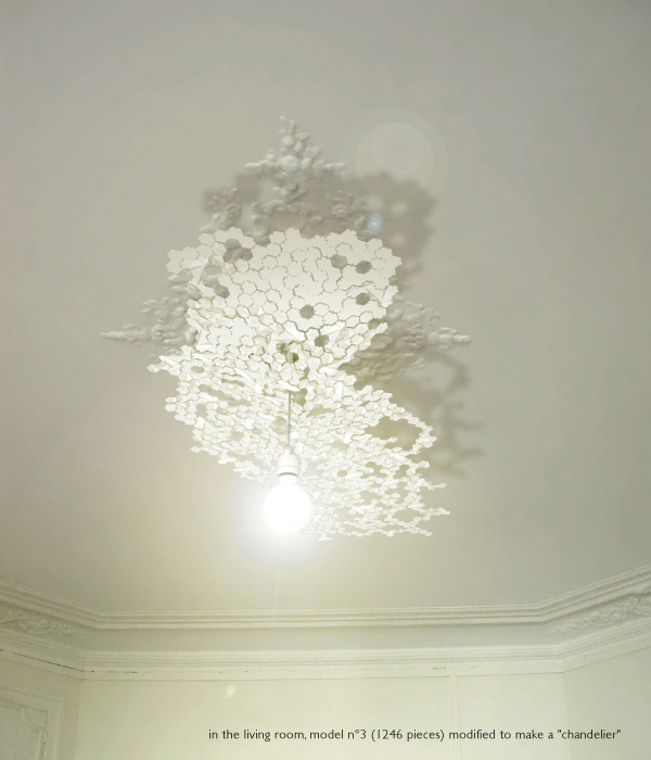 “Parure” is composed of 3 small pieces made of white crystal that we can be link together in multitude to build up a personal home jewels. Each structure so created is unique and can evolve. There is the metallic structure to fix on the ceiling or the wall, e.t.c.