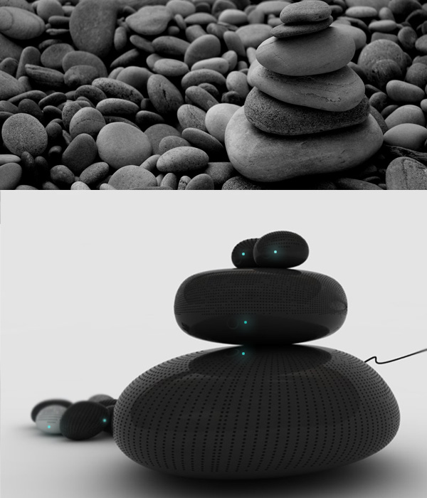 Based on a pile of stones, is a new mp3 speaker system that try to give the user the opportunity of choosing different positions for placing their speakers. This system try to give mobility like the mp3 players do and allow the user to use and share the speakers in a new way to interact with other people and create new sound areas for listening music.