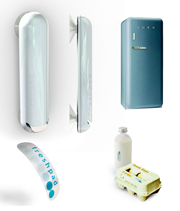 2. Freshpads are stickers that discolor over time when put inside a fridge due to thermal ink. Each day one dot dissolves, allowing you to see how long that carton of milk has been opened! A practical dispenser is mounted on the fridge door.
