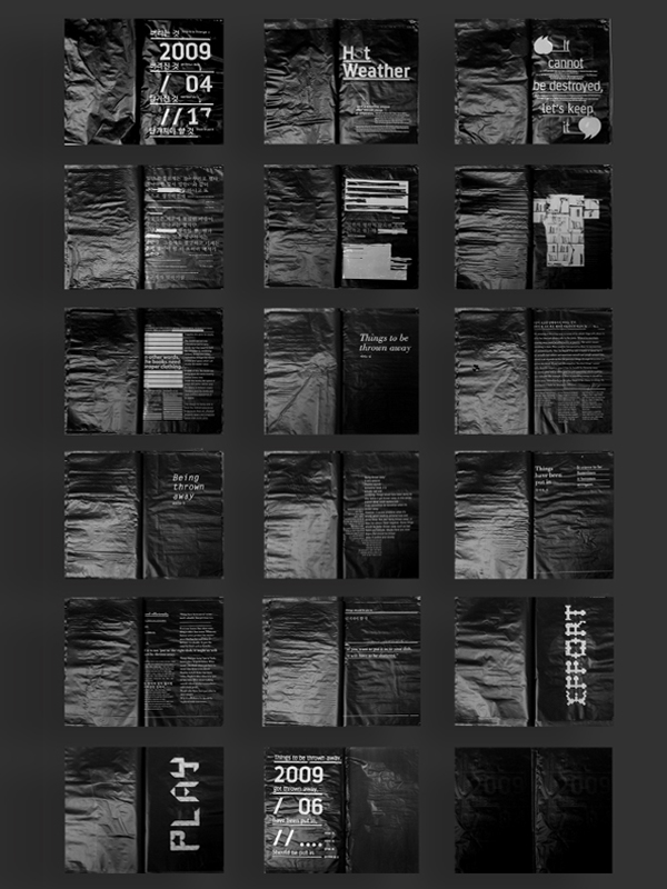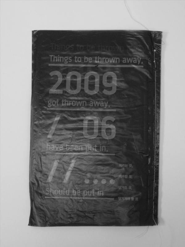 The Plastic Bag Book, planned, designed, made by myself, rethinks the meaning of casual things around us and measures their volume of their existence. The thoughts about the objects that are dismissed, being dismissed, put in or must be put in are comprised in words, graphic (typography, icon and image) and photographs. This is a silk-screen print on a plastic bag.