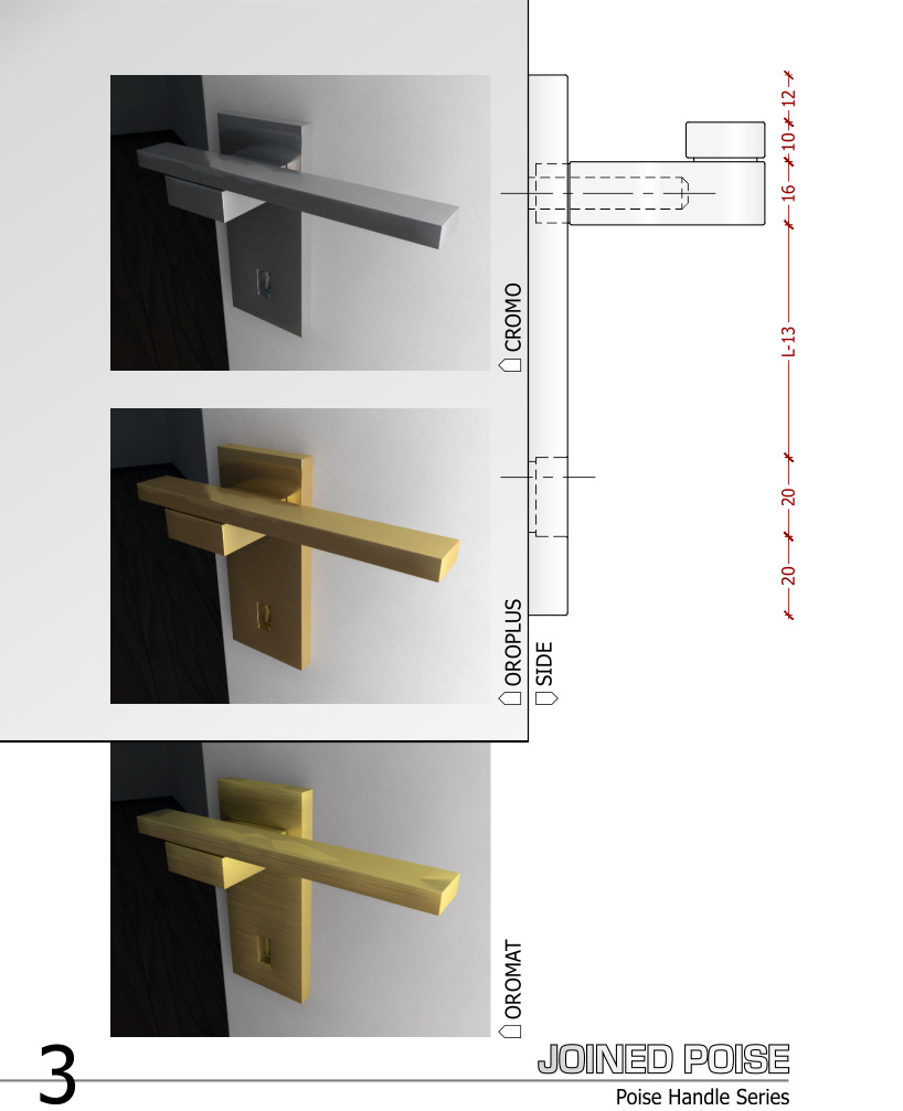 poise is a series of lever handles made by contemporary forms and high quality design, ensured with attention to the detail of a few elements assembled that, formally, return a pure solid “poised” on another. the minimalist design of the composition not only makes it suitable for everyday use but also makes it easy to match the different types of doors to satisfy multiple uses, both public and private. the dimensions follow the standards adopted for the production of locks and doors. however they’re adaptable to different requirements in agreement with the providers of these complementary elements. all handles in the series can be made with the classic finishes of colombo design, satin or glossy: cromat, oromat, cromo and oroplus. the series consists of five models submitted as five different projects: poise > basic handle with two distinct roses for the opening lever and for the lock-key; joined poise > handle with a single rose for the opening lever and for the lock-key; long poise > handle with opening lever longer to satisfy diverse aesthetic needs; poise (with lock) > handle with locking latch; bi-poise > handle that combines two different finishes (in addition to classical finishes including black hard rubber and rosewood)