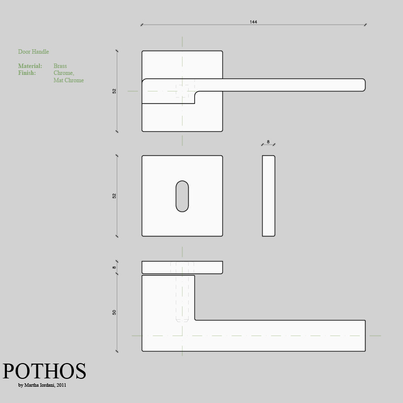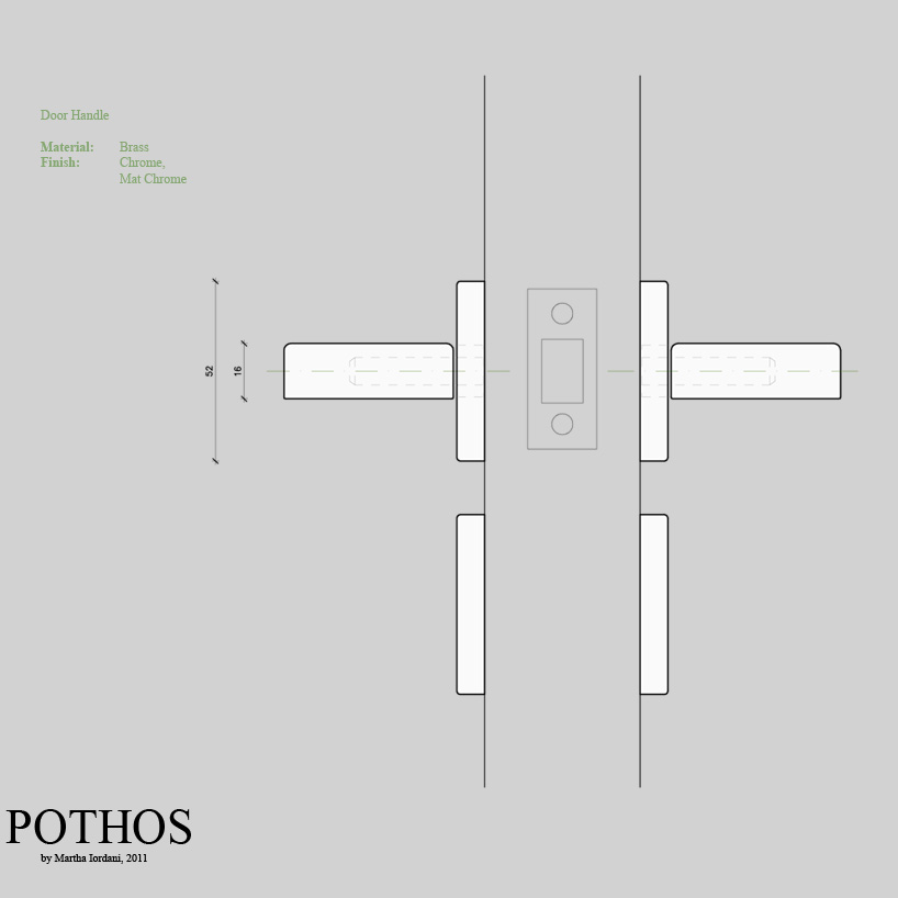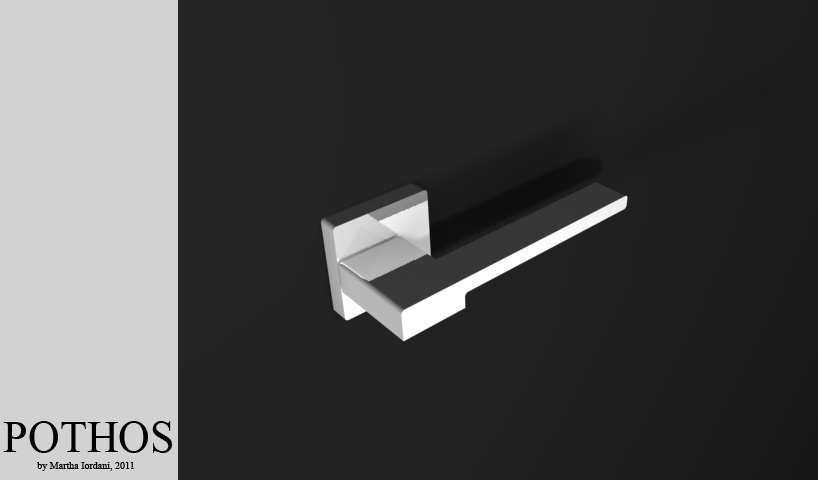 the rectangular part which mounts on the latching mechanism, on the core of the lever, has been extended till the edge of the rosette to make their relationship much stronger. it is a rectangular, solid and elegant, strong and soft, rational design but yet not austere. the edges are round to soften the design and perhaps the edges on the back side of the lever are rounded more for the sake of a softer touch. on the other hand the edges on the rectangular part at the bottom are angular to exalt its square character.