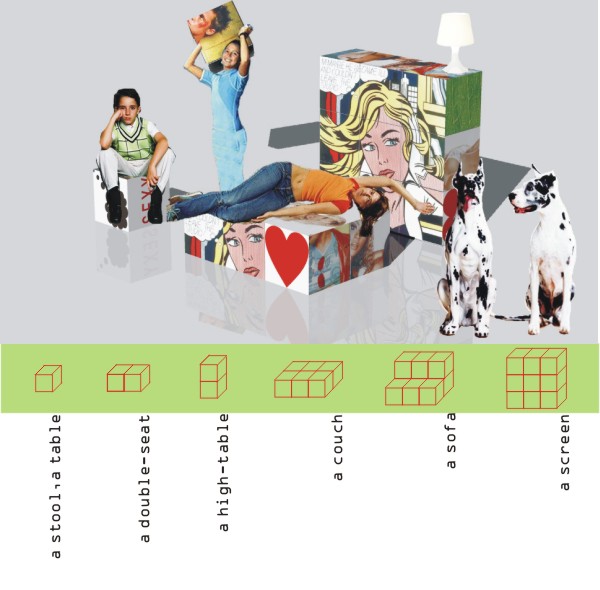 Puzzle F is furniture combined with a puzzle. This project resembles how children play, creating pictures out of their environment by using what exists there. Puzzle F is a set of cushions, covered with printed textiles, that can be used as individual seats, or combined together to make a couch, a sofa, a screen, the possibilities are many. Each cushion has a part of a picture on each of it’s six faces. By arranging the cushions in a particular way different pictures can be made. The arrangement can also create a mixture of a picture, a puzzle for someone to solve. The cushions unite through the use of magnets inside. These magnets attract thereby holding the cushions together.
