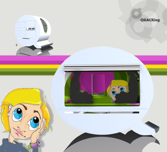 Major target group of "quacking" furniture are teenagers who share their room with their relatives. The concept of the "quacking" is to offer a sound isolated space for their conversational, hang out, read, sleep, etc. privacy. To pervent teenagers to be "too private" there are windows for parent survalance. Shape of the "quacking" has its roots from comic books; as a symbol for dialog.