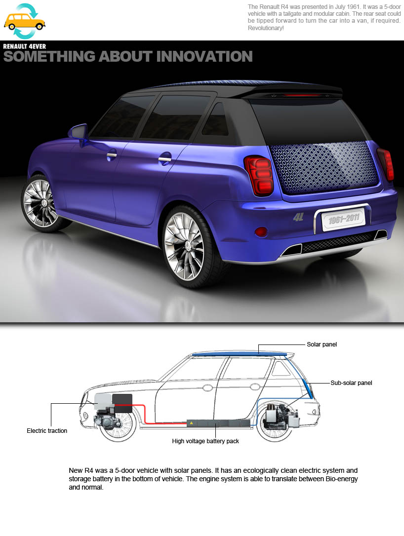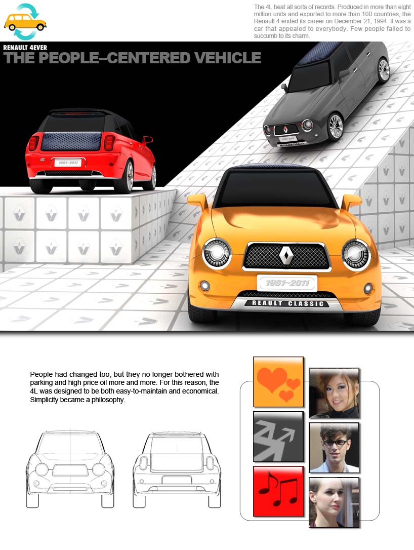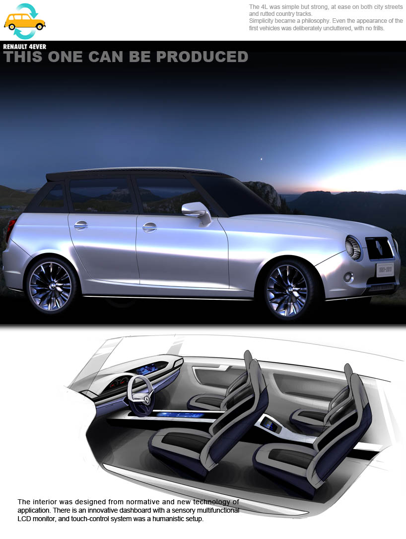 How the re-design does inherit Renault 4’s spirit and meaning? I think the classical characteristics should be followed, but adapted for 21st century style. However, type of vehicle and using methods are much more important.