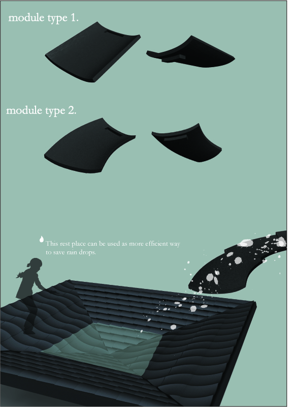By saving rain drops and use this for fountain and others, we can save (energy to purify) tap water. Furthermore this rain suite space will lead to interaction between people and improve green city environment.