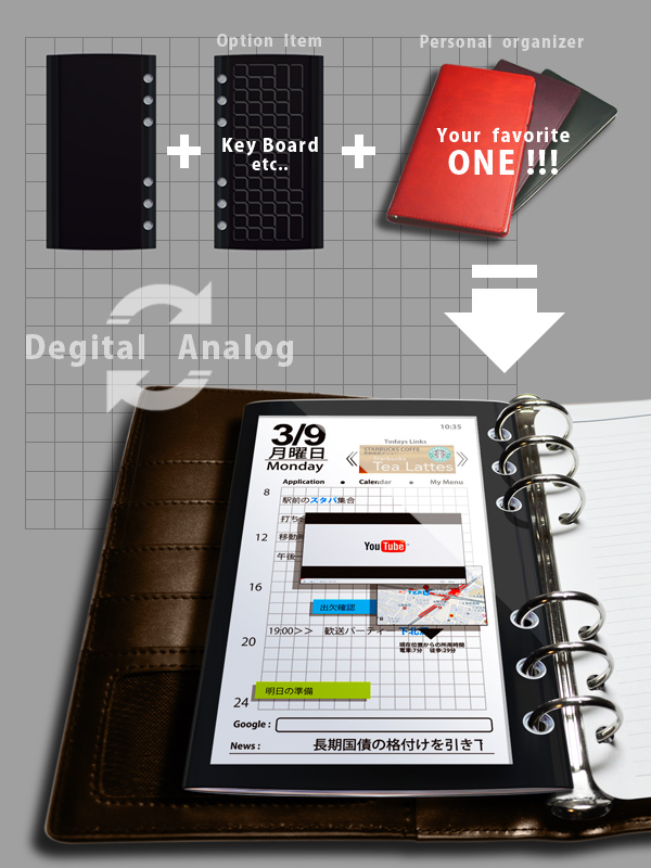 2:身近なツールであるシステム手帳に装着して使用する、タッチパネル式モバイルPC「refill」。デスクトップ画面に代わり、スケジュール表を起点にしたGUIは、ユーザーの予定や現在位置に即した情報を提供する。本体サイズはバイブルサイズのリフィルと同規格で、任意のデザインを選べるカバーはプロテクターの機能も兼ねる。手帳の持つ機能を活かし、キーボード等のオプションもバインドして追加可能。また既存のリフィルと組み合わせれば状況に応じてアナログとデジタルの使い分けができる。