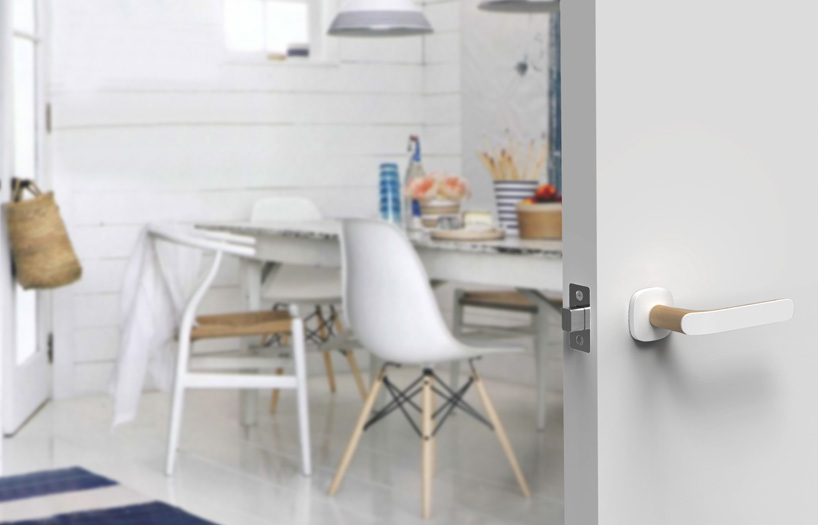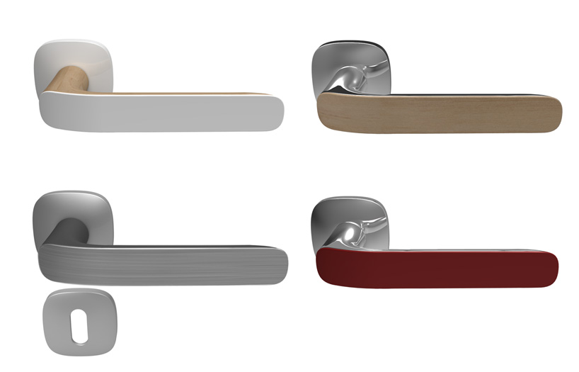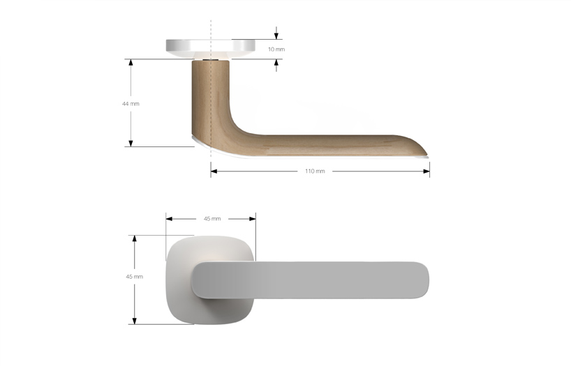 it's surprising how many door handles on the market are made of one single material. chrome and aluminum are ideal choices because they blend into a multitude of environments. however, i believe today's design sensitive consumers are looking for more ways to enliven their spaces, and would like their homes to reflect their personalities. reflect explores this notion by creating a door handle that tailors itself to the user with a customizable faceplate. customers can combine colors and materials to truly offer a flexible way of invigorating their living space. the form is ergonomic curving in the thumb area and staying soft all throughout. the handle maintains a geometric outer profile while retaining a fluid inner shape.