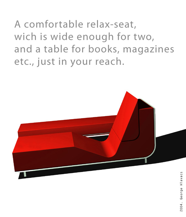 After turning the back part down and putting the triangle pillow to an other position, it becomes an ergonomic relax seat with a huge table for books, newspapers, coffee, tea (a tray is suggeted), notebook computer or anyting else.