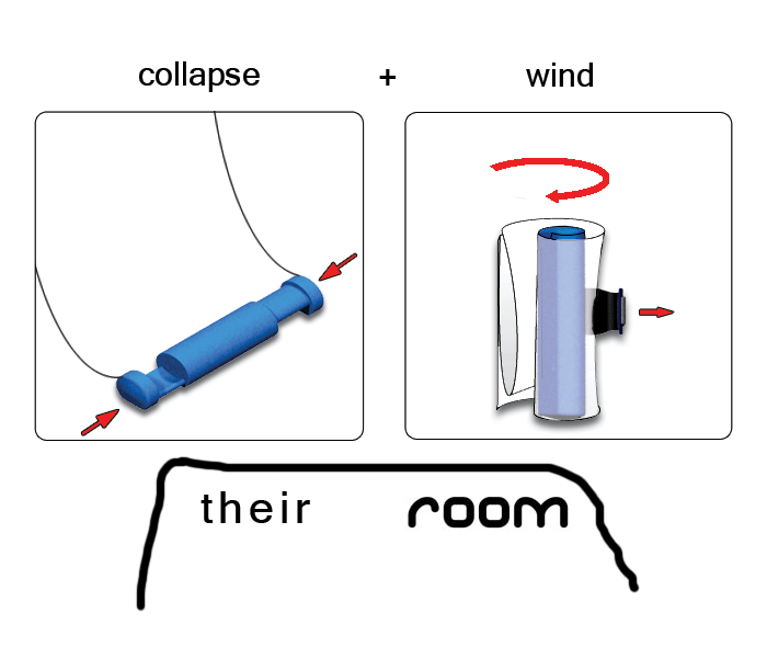 Room is an easily deployable shelter, resting place, gathering point, or private space. The rip-stop nylon shell is unrolled and the base section expands on either side providing resting points. The shell is then held in shape by tensioned polypropylene bars. The base section supports an electronics band which provides battery powered speakers and lights, and a holder for personal music devices. This electronics band can be removed when back at home and the speakers can be used while it is recharging.