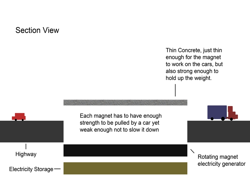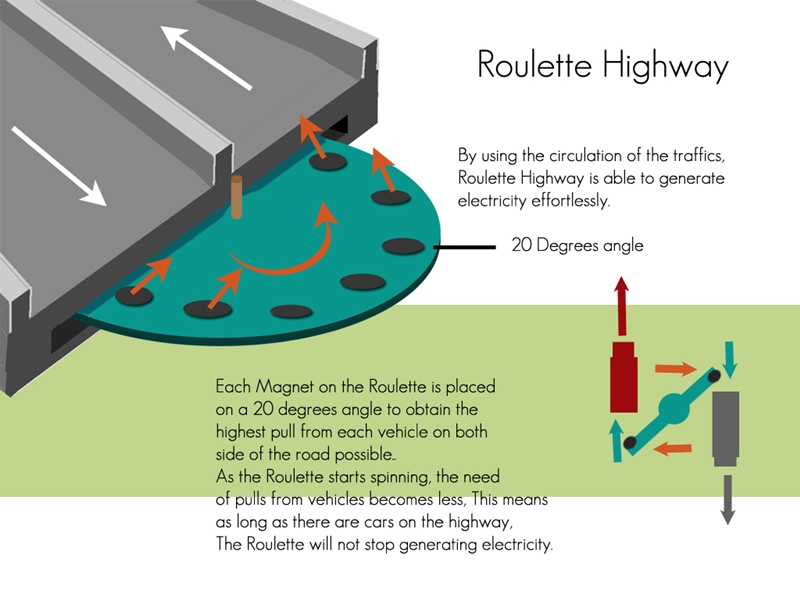 Highway is a never ending circuit of traffics and the Roulette Highway System clearly uses this as an advantage. The rotary magnet platform rotates as cars passes; since there are two opposite sides to a highway, the pulls are twice as effective and the needs of pull becomes less as the platform spins. This rotary motion generates electricity which is then stored underneath the highway and can be used to power street lights or other sources.