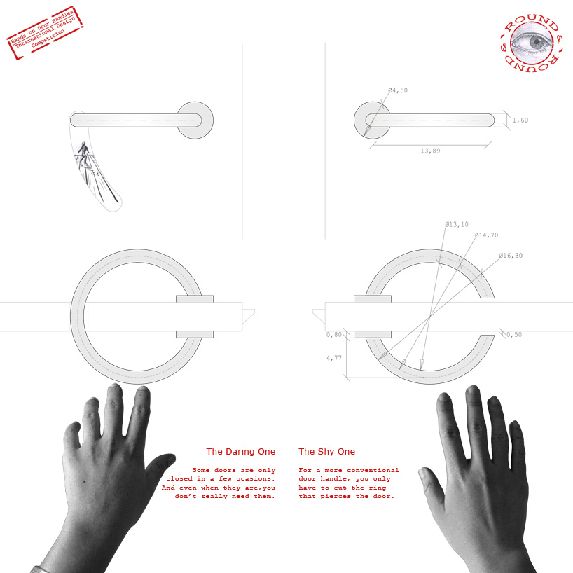 the material can be brass, finish chrome or mate chrome. the "daring one" version should be made with two semicircles joined in the point where the door is pierced.