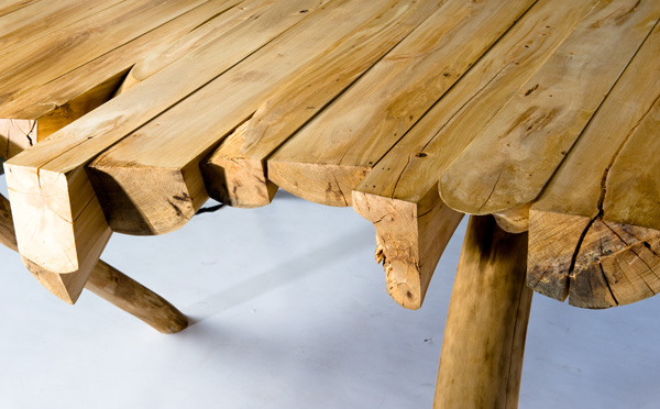 Creating a table out of a tree isn't too difficult when you let the wood dry properly, cut it into straight pieces and nail these back together in the desired furniture piece.