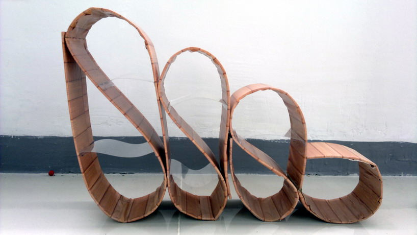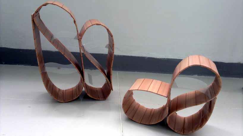 this design named is 's'-shelf, which is contain bookshelf and chair. this is made from bamboo, which there is an iron wire in the center of the bookshelf and it is eco-friendly. and to put the book, we give glass on the shelf. the real height is 110 cm, width is 160 cm, and depth is 30 cm.