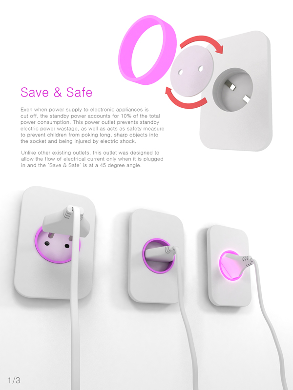 Unlike other existing outlets, this outlet was designed to allow the flow of electrical current only when it is plugged in and the 'Save & Safe' is at a 45 degree angle.