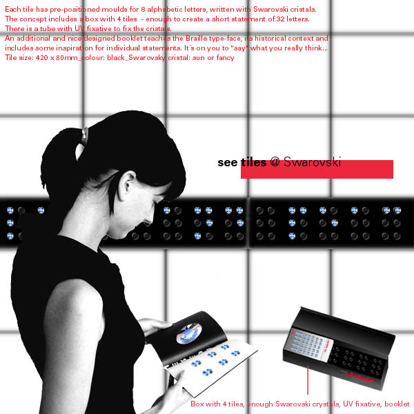 The concept includes a box with 4 tiles - enough to create a short statement of 32 letters. There is a tube with UV fixative to fix the cristals. An additional and nice designed booklet teaches the Braille type-face, its historical context and