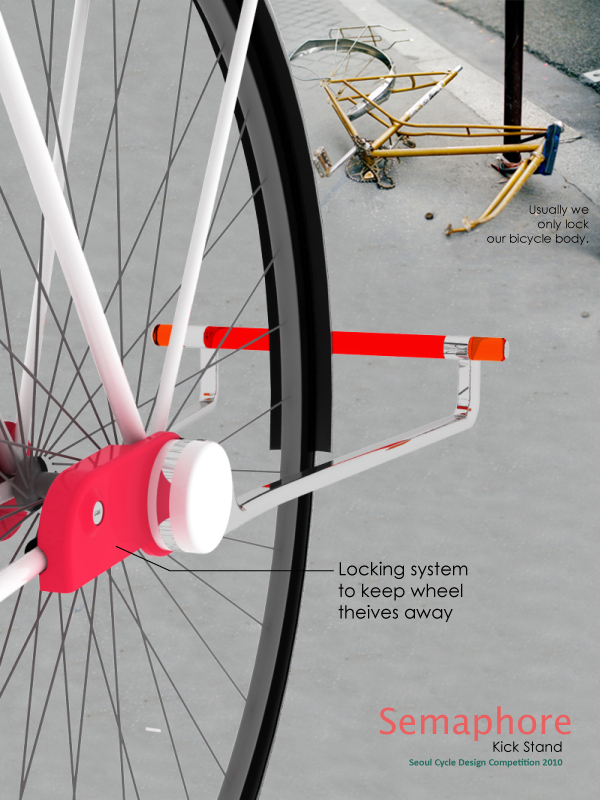 Semaphore is a bicycle kickstand with in-built signal lights. Most accidents involving bicycles are caused by miscommunication between cyclists and the motorists. Semaphore aims to make signal lighting on bicycles less of a hassle by being self-sustaining. It converts kinetic energy from pedaling using electromagnetic induction. The kickstand also acts as a wheel lock, preventing bicycle wheel thefts and allow an easier bicycle locking experience.