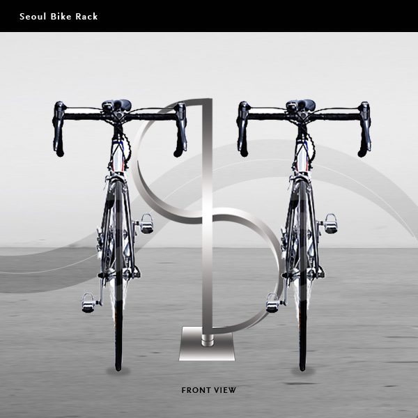 The Seoul Bike Rack is inspired by the ying and yang symbol of the South Korean flag. It is intended for public spaces to enable people to securely lock their bikes to it. When seen from the side, the bike rack is reminiscent of the ying and yang symbol. When seen from the front you can see either the ying and yang symbol or an 'S' for Seoul. The 'S' bend is ideal as it projects out from either side of the bike rack and allows users to lock their bikes next to each other without getting their handlebars tangled. It also provides multiple locking points and can accommodate all shapes and sizes of bikes.