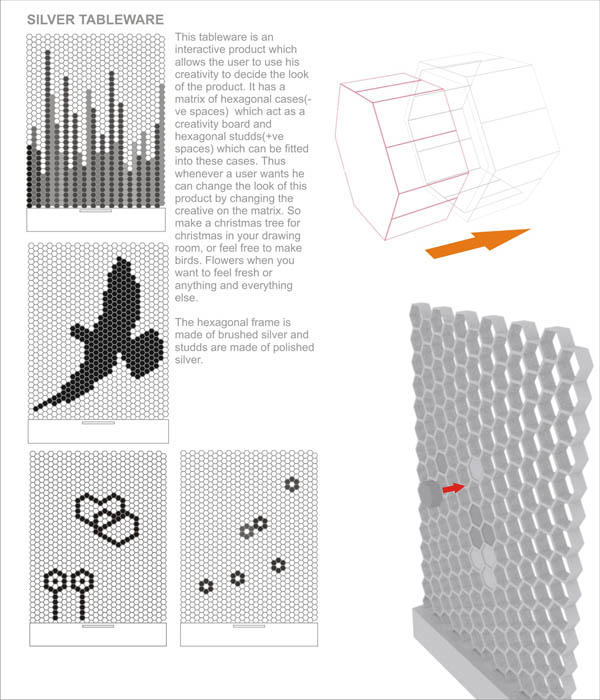 This tableware is an interactive product which allows the user to use his creativity to decide the look of the product. It has a matrix of hexagonal cases(-ve spaces) which act as a creativity board and hexagonal studds(+ve spaces) which can be fitted into these cases. Thus whenever a user wants he can change the look of this product by changing the creative on the matrix. So make a christmas tree for christmas in your drawing room, or feel free to make birds. Flowers when you want to feel fresh or anything and everything else.